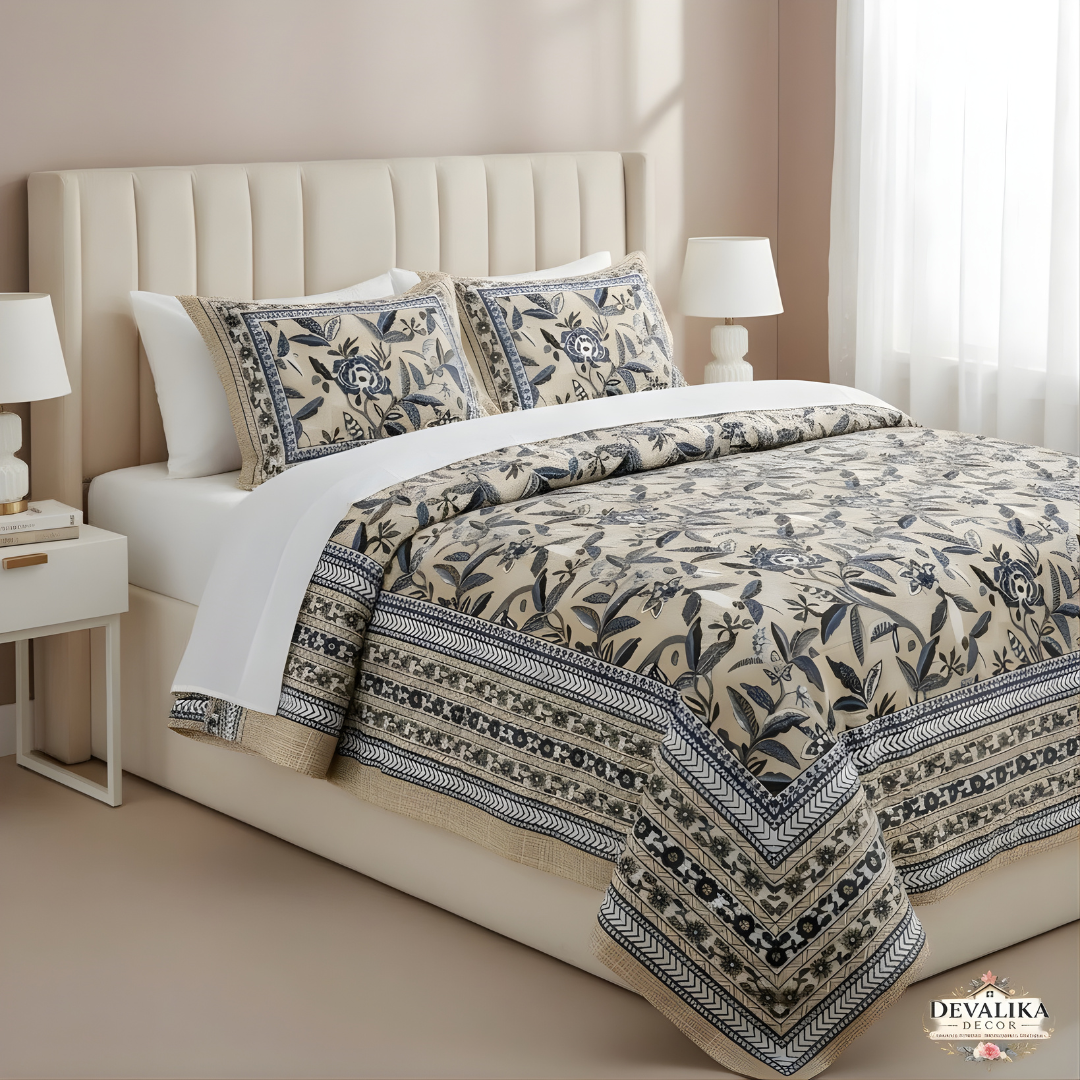 Beige & Navy Blue Floral Jaipuri Cotton King Size Bedsheet (108×108) With 2 Pillow Covers