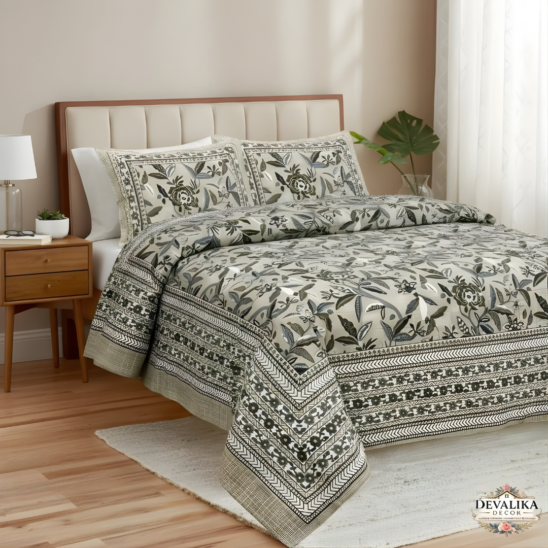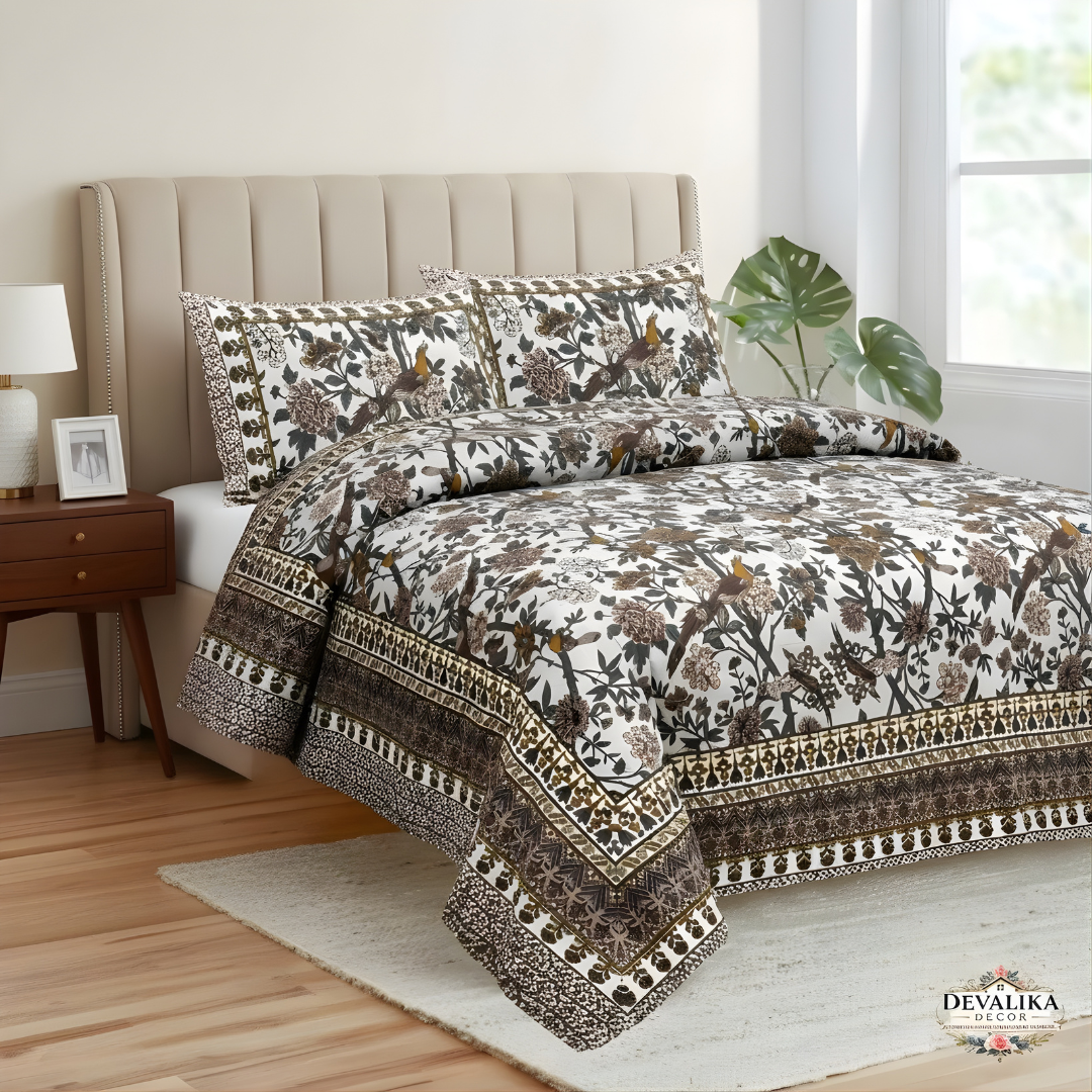 Forest Bloom Jaipuri Cotton Bedsheet – Brown & Ivory Floral | King Size 108×108