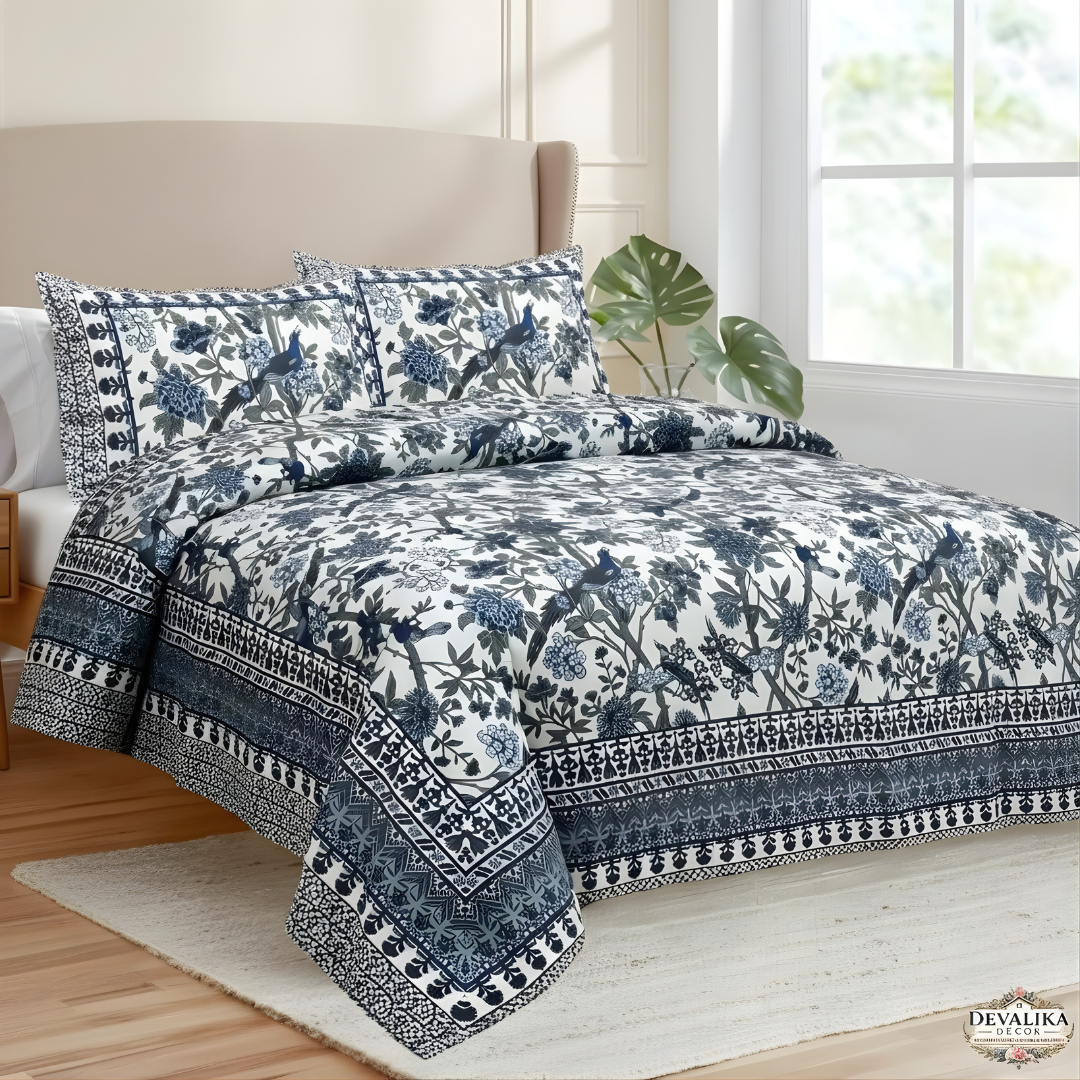 Indigo Garden Jaipuri Cotton Bedsheet – Blue & Ivory Floral | King Size 108×108