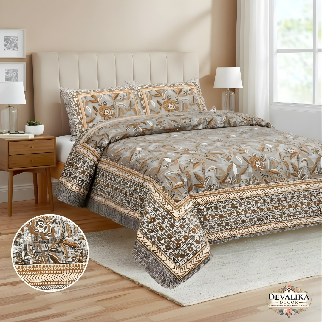 Desert Bloom Jaipuri Cotton Bedsheet – Beige & Caramel Floral | King Size 108×108