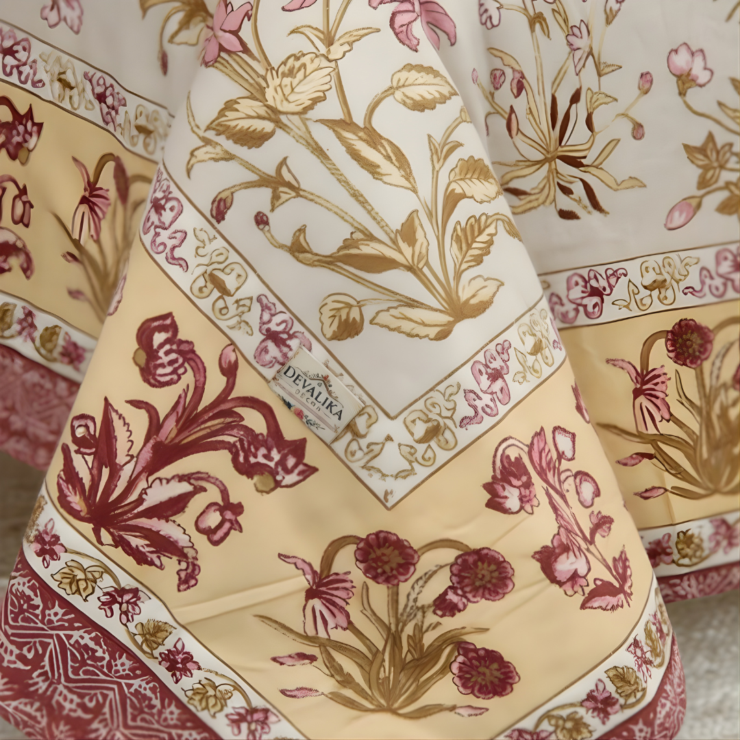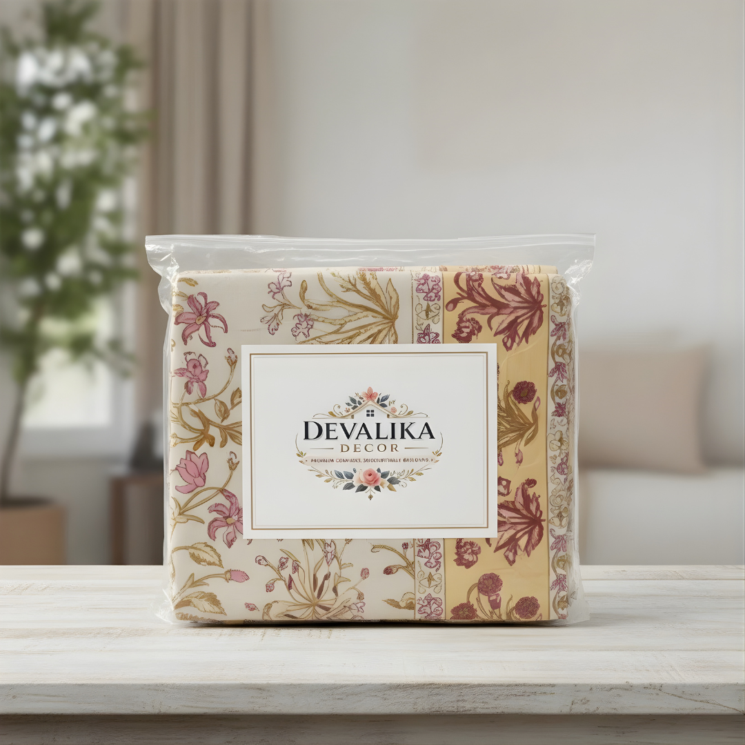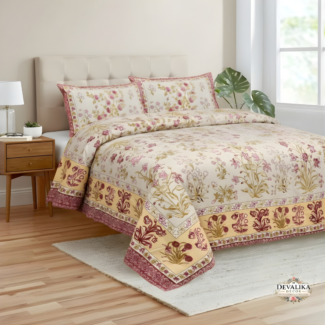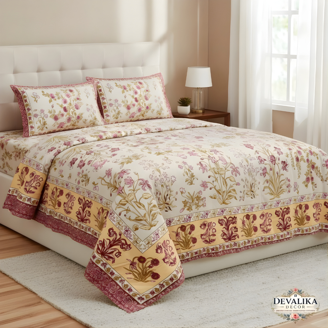 The Royal Floral Jaipuri Bedsheet is inspired by the beauty of traditional Jaipuri textile art, featuring delicate floral motifs and elegant border patterns.