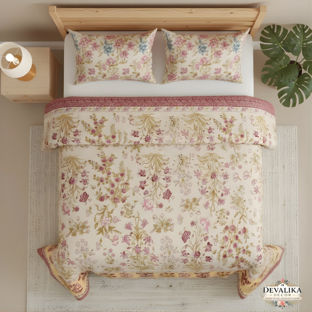 The delicate floral patterns reflect the charm of traditional Jaipuri textile heritage, bringing an artistic and timeless character to your bedroom décor.
